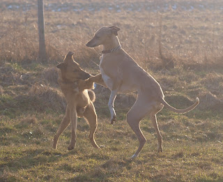 Senatet, Yeki und Sikra verfielen dem Mischlingsrüden Lucky restlos. Selten habe ich die Hunde so ausgelassen mit einem anderen Hund spielen sehen. Lucky ist aber auch perfekt, er hat ein tolles Sozialverhalten und ein richtig gutes, moderates Durchsetzungsvermögen. Die Azawakhs waren hingerissen und auch Paco war recht angetan.